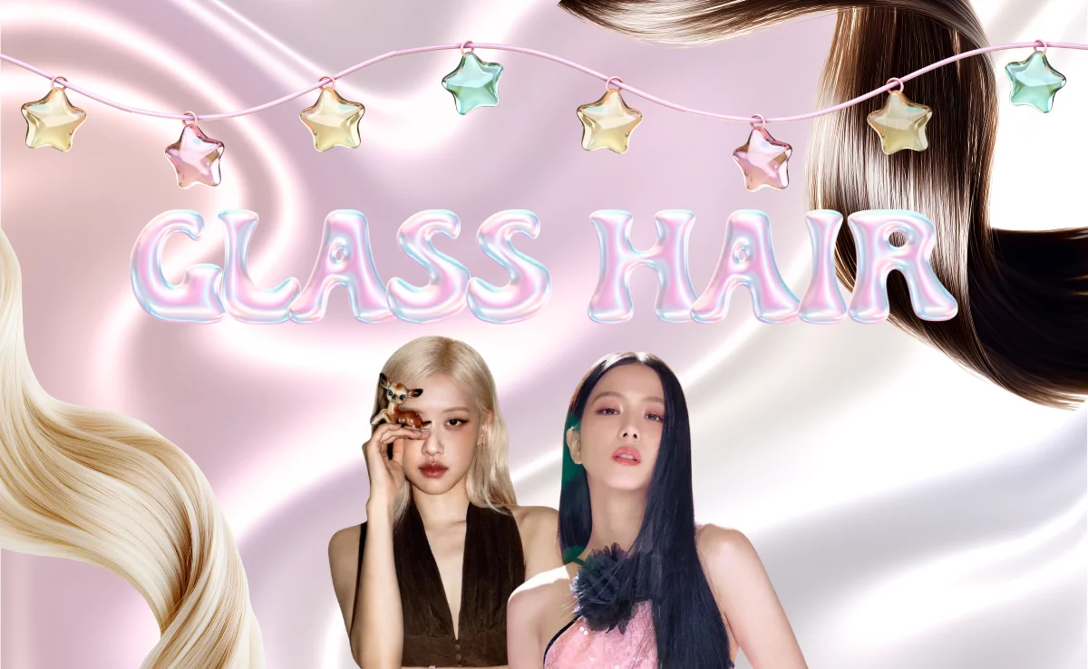 "Glass hair" means hair that is extremely healthy, shiny and smooth (like glass). The look is the result of proper overall health of the hair's cuticle layer through maintenance among other things (i.e., aligned cuticles, physically hydrated, protein structural integrity). Korean beauty salons provide premium services which often includes multiple steps of alkaline rinses, protein masks and heat activated sealing agents in order to provide this look.